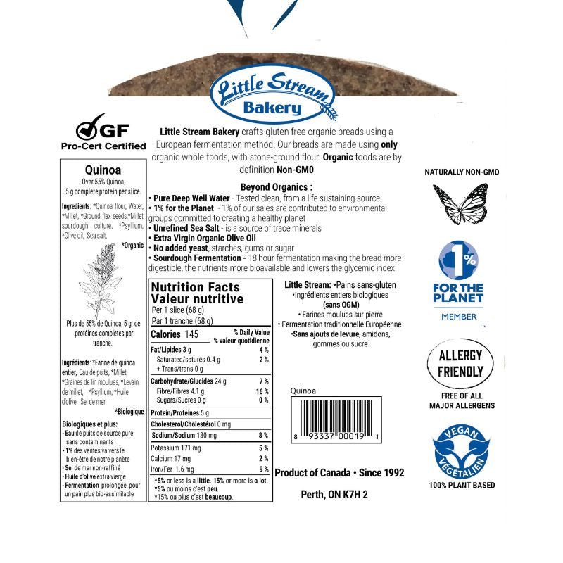 Ingredients: *Quinoa flour, Water, *Millet, *Flax seeds, *Millet sourdough culture, Psyllium seed husk, *Olive oil, Sea salt (*Organic).